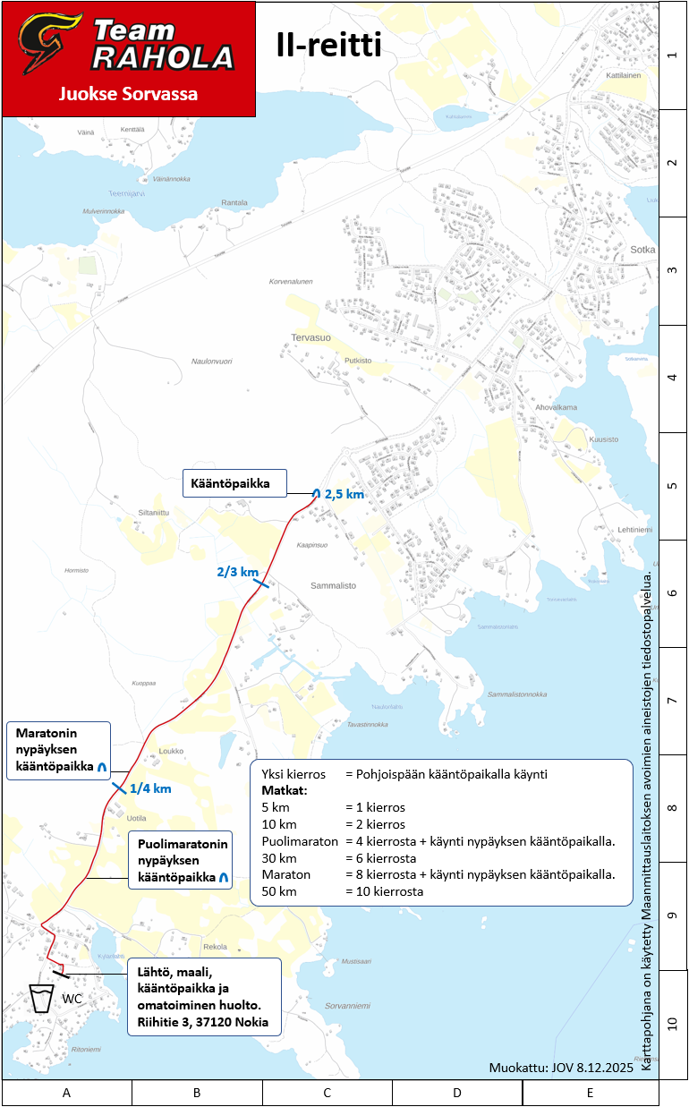 | Reitti on 2,5 km edestakainen maantiepätkä. Puolimaratonilla ja maratonilla on merkattu kääntöpaikka puuttuvia metrejä varten. 5 km:lla juostaan 1 kierros, 10 km:lla 2 koko kierrosta, puolimaratonilla 4 koko kierrosta + ’nypäys’, 30 km:lla 6 koko kierrosta, maratonilla juostaan 8 koko kierrosta + ’nypäys’, 50 km:lla 10 koko kierrosta. Reitti on virallisesti mitattu. Jokainen juoksee liikennesääntöjä noudattaen omalla vastuullaan. Reittikartta | |